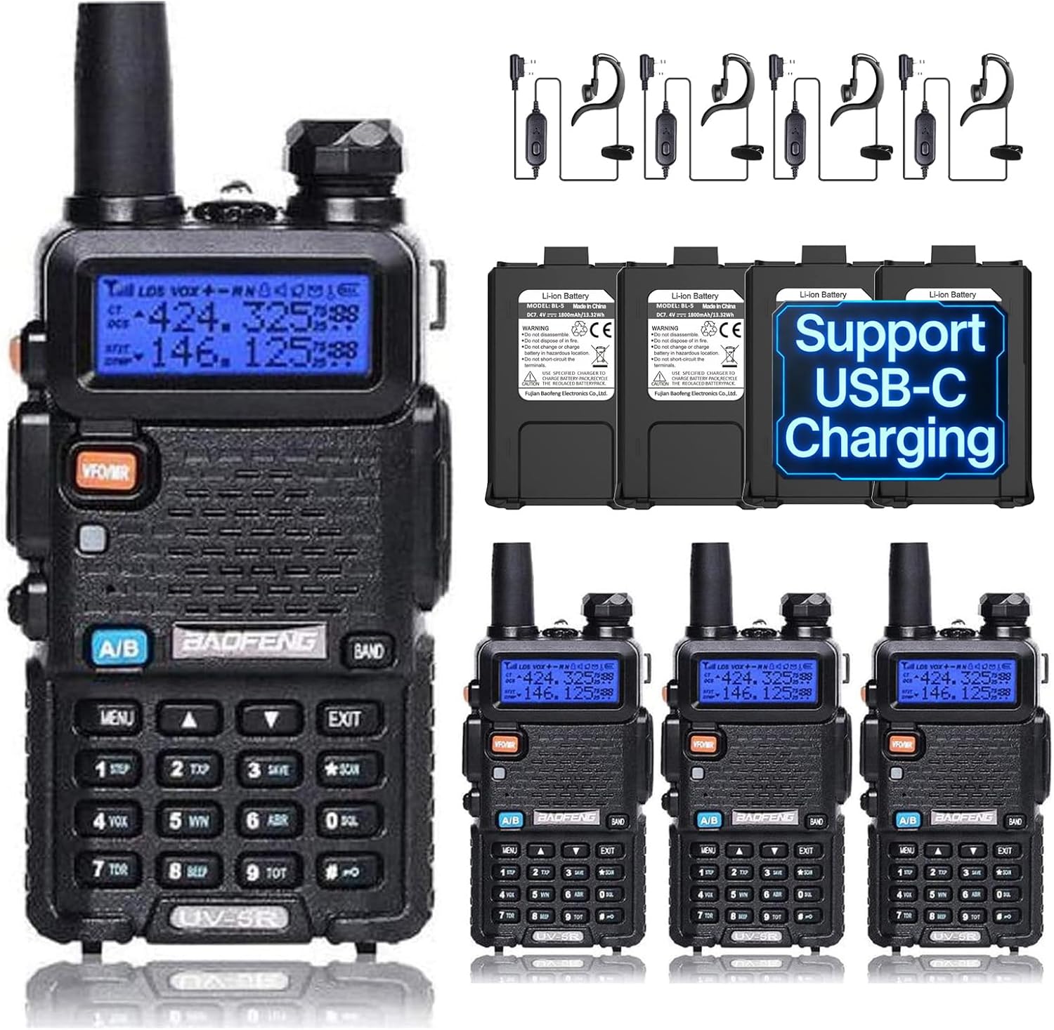 | BuiltIn Media | 4 x BAOFENG UV-5R 8W radio with antenna, 4 x 3800mAh battery with type-c port, 4 x Headset, 4 x Charger, 4 x Belt clip, 4 x Hand strap, 1 x English manual |