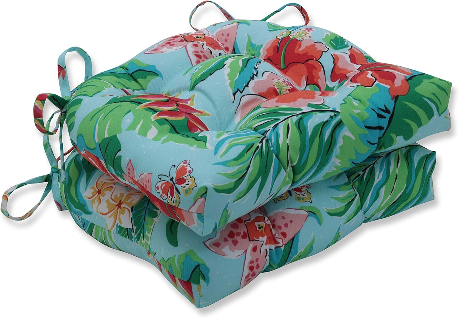 Add ambiance to your porch with the gorgeous flair of this set of two large outdoor tufted chair pads. Their watercolor pattern with large-scale, detailed flowers is in shades of red and orange on an off-white ground. Fabric is durable and fade resistant. Additional features of these large outdoor tufted chair pads include 14" ties to secure the cushions to your furniture and recycled polyester fiber fill with sewn seam closures. Also suitable for indoor use in kitchen and dining areas.